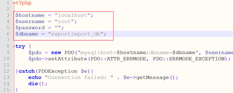 - Find the dbconnection.php page in ExportImportMySQLData folder